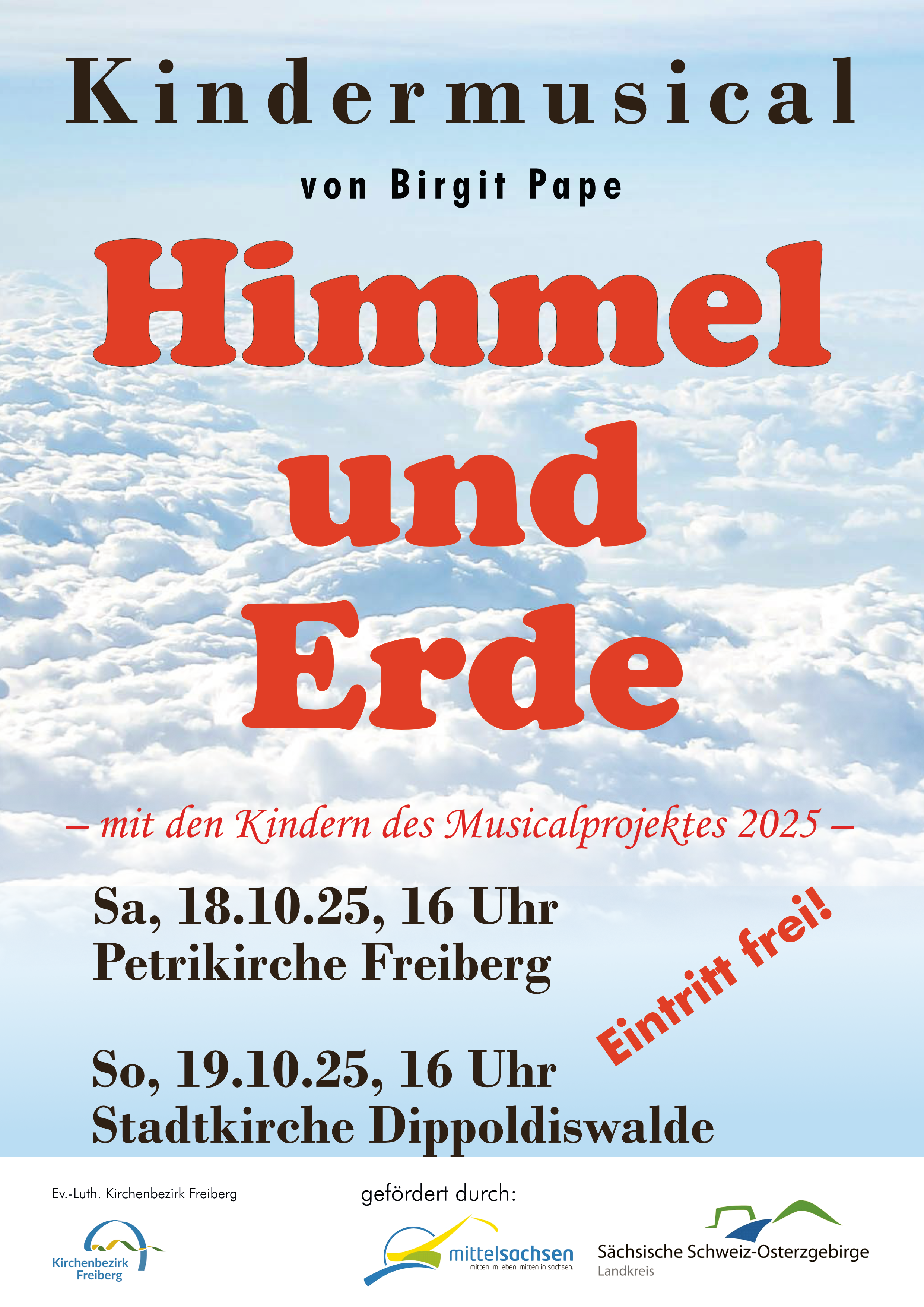 Zum Abschluss des Kinder Musical-Projektes laden wir sie alle zur Aufführung des Musicals „Himmel und Erde“ von Birgit Pape nach Dippoldiswalde in die Stadtkirche ein. Alle Teilnehmenden des Projektes musizieren gemeinsam mit Instrumentalisten unter der Leitung von Anne Kopp, Katharina Reibiger und Clemens Lucke und erzählen die Schöpfungsgeschichte aus Sicht der Wolken. Der Eintritt ist frei, wir freuen uns über Spenden, die zur Deckung der Unkosten dienen.