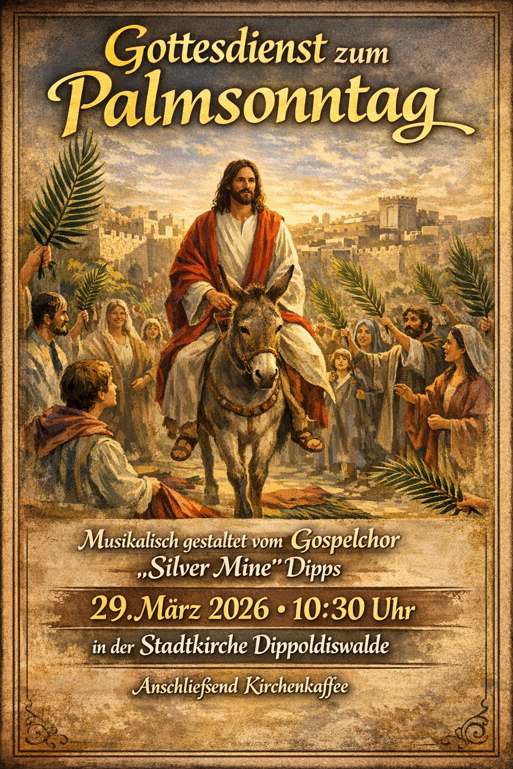 Herzliche Einladung zum Palmsonntagsgottesdienst. Musikalisch gestaltet vom Gospelchor ,,Silver Mine". Sagt es weiter und bringt viele mit. Anschließend gibt es noch Kirchenkaffee.