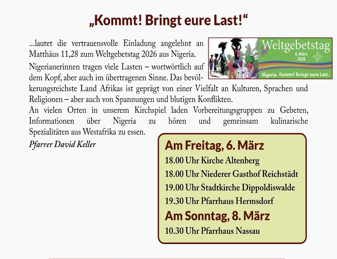 Sie sind auf der Seite der evangelisch-lutherischen Kirchgemeinden Dippoldiswalde, Hennersdorf, Kipsdorf, Reichstädt, Sadisdorf und Schmiedeberg.
