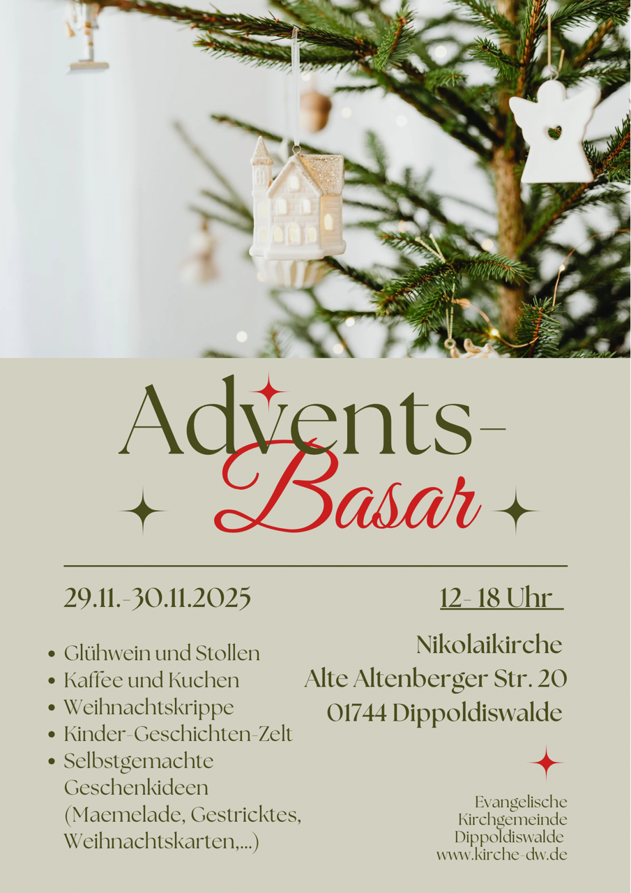 Am dritten Adventswochenende (13.12.-14.12.) können Sie beim Dippser Weihnachtsmarkt auch einen Abstecher in unser Gemeindehaus und unsere Kirche machen. Ganz besonders empfehlen wir unser Adventskonzert „Macht hoch die Tür“ am 14.12. 17 Uhr mit unserer Kantorei und dem Gospelchor SilverMine (Eintritt frei, Spenden erbeten).